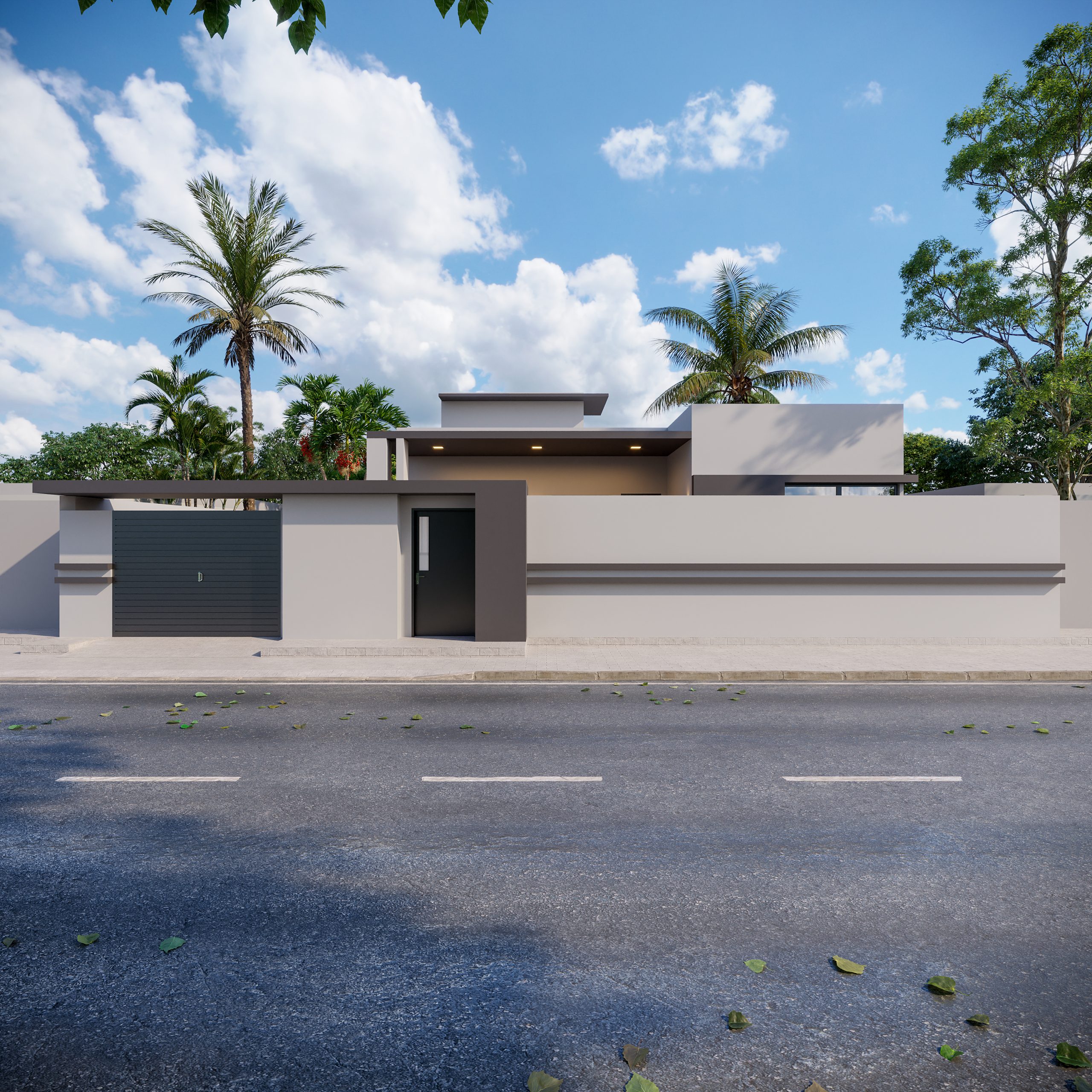 Le rez-de-chaussée s’organise autour d’un séjour-repas convivial, d’une cuisine fonctionnelle avec escalier, d’un garage intégré et de quatre chambres, chacune équipée de sa salle de bain privative, assurant confort et intimité. La façade avant, volontairement minimaliste, intègre une terrasse couverte et le garage, créant une transition fluide entre l’espace public et l’habitat tout en offrant un accueil ombragé et fonctionnel. À l’arrière, le bâtiment s’ouvre sur un espace d’élevage domestique aménagé, composé d’une pelouse clôturée pour poules et lapins, d’un poulailler dédié et d’une terrasse couverte, faisant de cet extérieur une véritable extension productive et vivante de la maison.